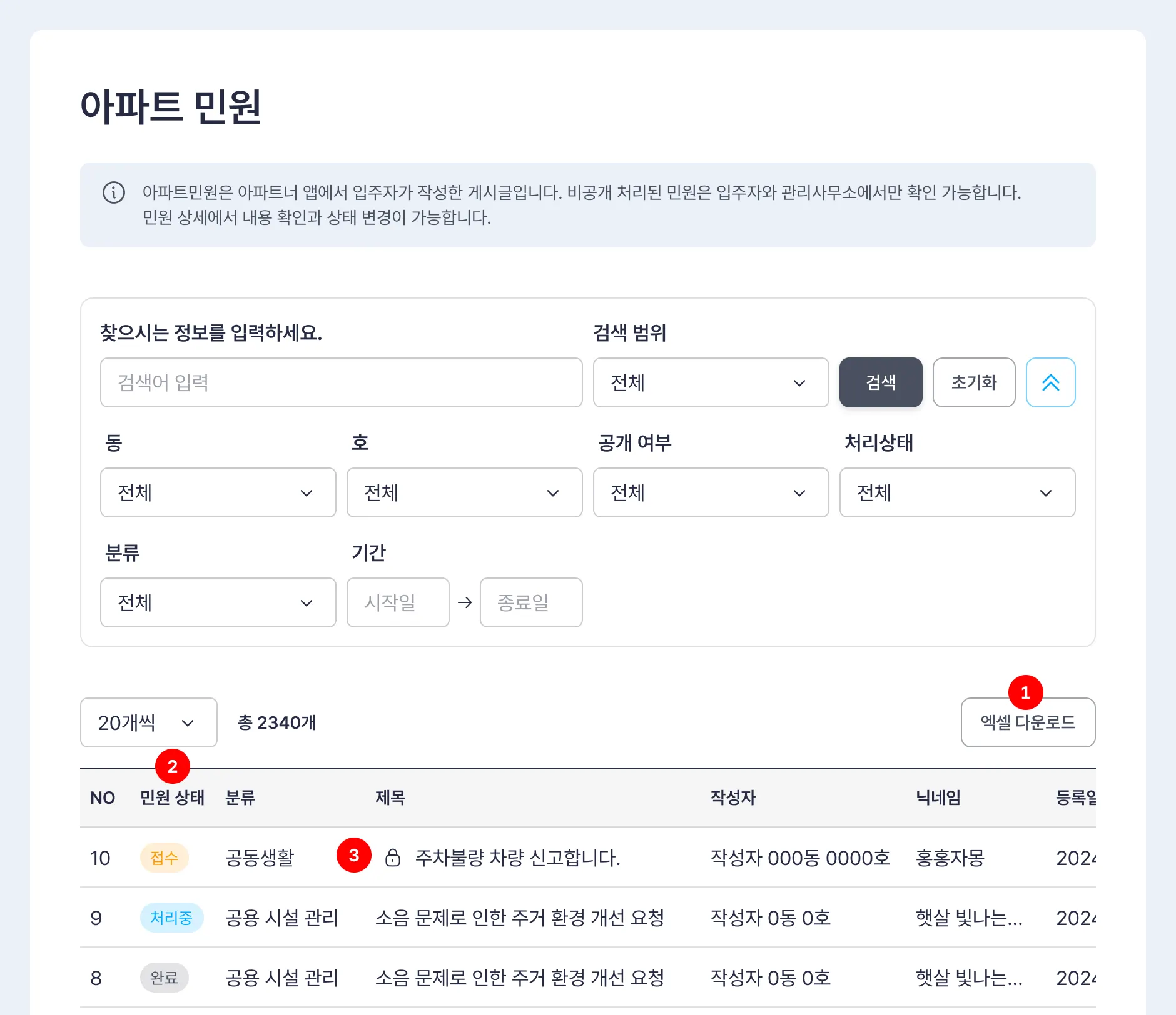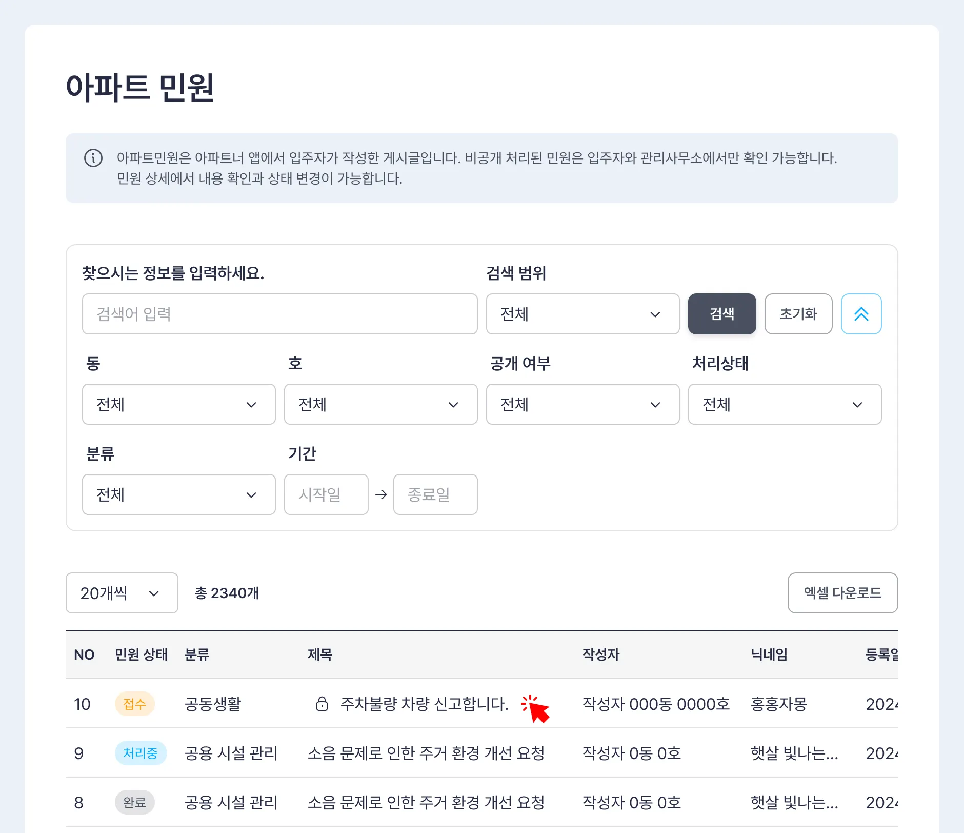 비공개로 접수된 민원은 아이콘으로 표기되며 해당 게시글은 작성자와 관리사무소만 확인 할 수 있습니다.