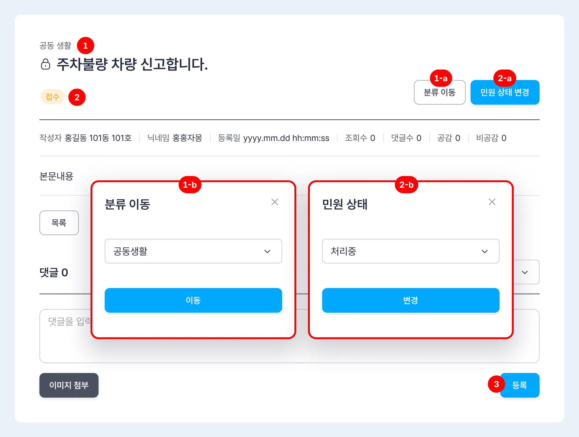 ‘접수’로 표시되어 있는 상태를 변경해서 민원 처리상태를 입주민에게 알릴 수 있습니다.