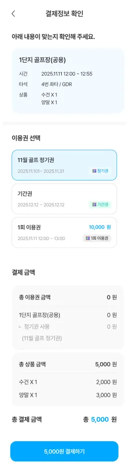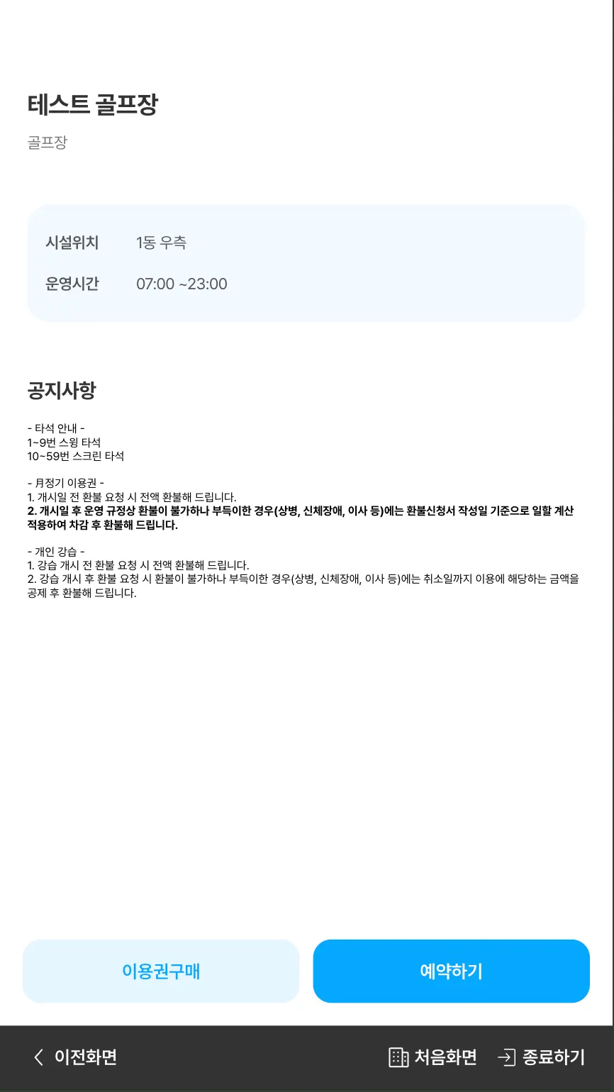 기본정보 화면에서 하단의 [이용권 구매] 버튼을 누르면 시설에서 판매하는 이용권을 구매할 수 있습니다.