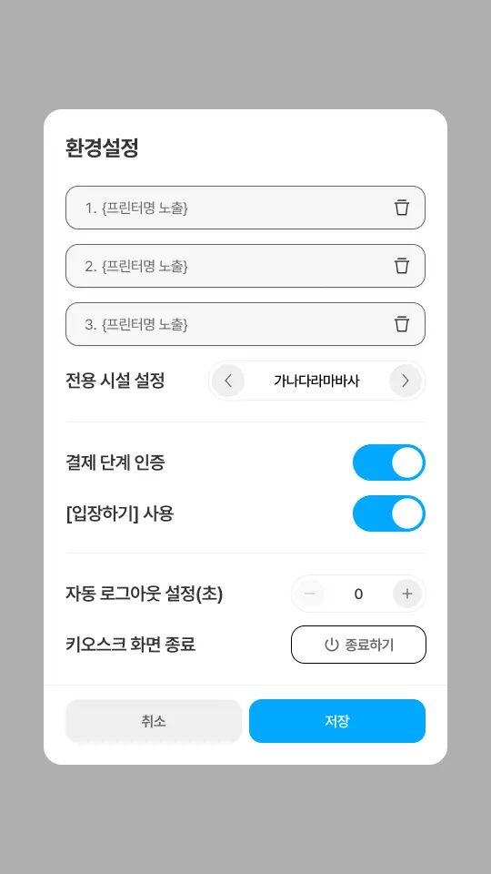 주문서, 영수증 등의 출력이 필요한 시설의 경우 프린터를 설정할 수 있습니다.