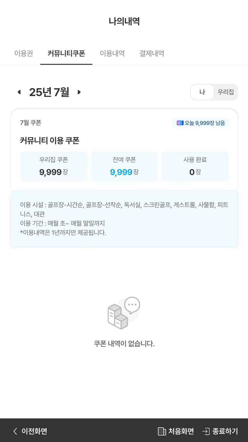 월 기준으로 세대별 지급된 커뮤니티 쿠폰의 총 개수, 사용 가능한 잔여 쿠폰, 사용 완료된 쿠폰을 확인할 수 있습니다.