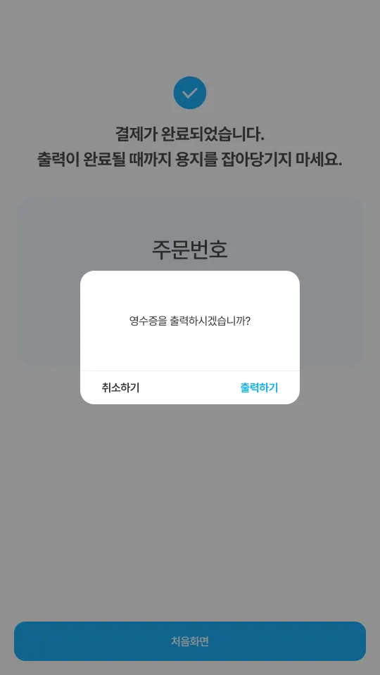 주문 완료 페이지에서 영수증 출력 여부를 확인하며 출력을 희망할 경우 영수증과 교환권 모두 출력되고, 출력을 거절할 경우 교환권만 출력됩니다.