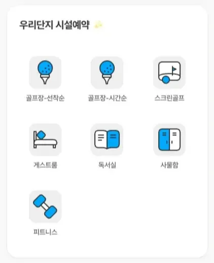 화면에 표시된 아이콘은 커뮤니티 시설을 분류한 항목이며, 원하는 아이콘을 선택하면 해당 시설에서 예약 가능한 시설들을 확인할 수 있습니다.
