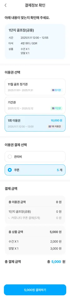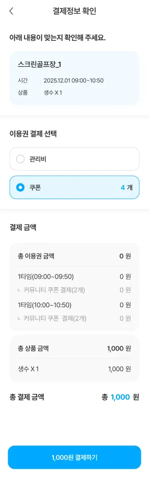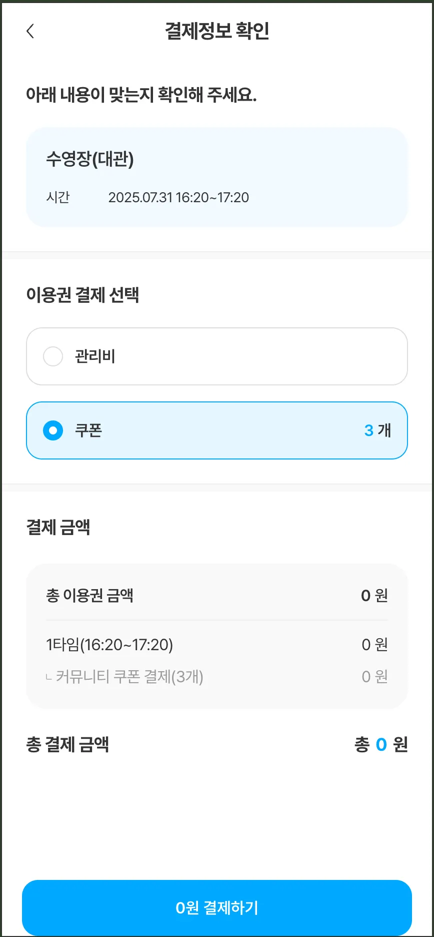 결제는 시설 및 해당 시설의 이용권 운영 정책에 따라 관리비 또는 커뮤니티 쿠폰으로 결제가 가능합니다.