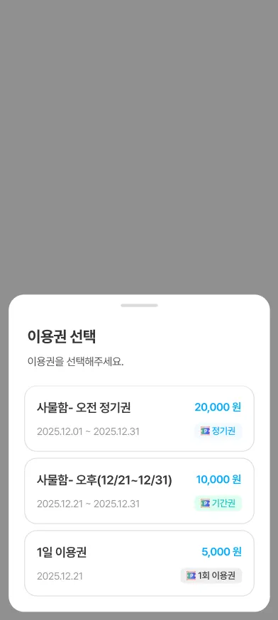 이용권을 선택하면 사물함 지정이 가능하며, 선택한 이용권의 가격이 그대로 적용됩니다.