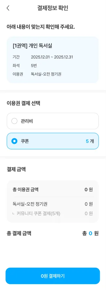 쿠폰 사용 페이지에서 사용할 쿠폰 개수를 선택한 후 [결제하기] 버튼을 누르면 즉시 결제가 진행됩니다.