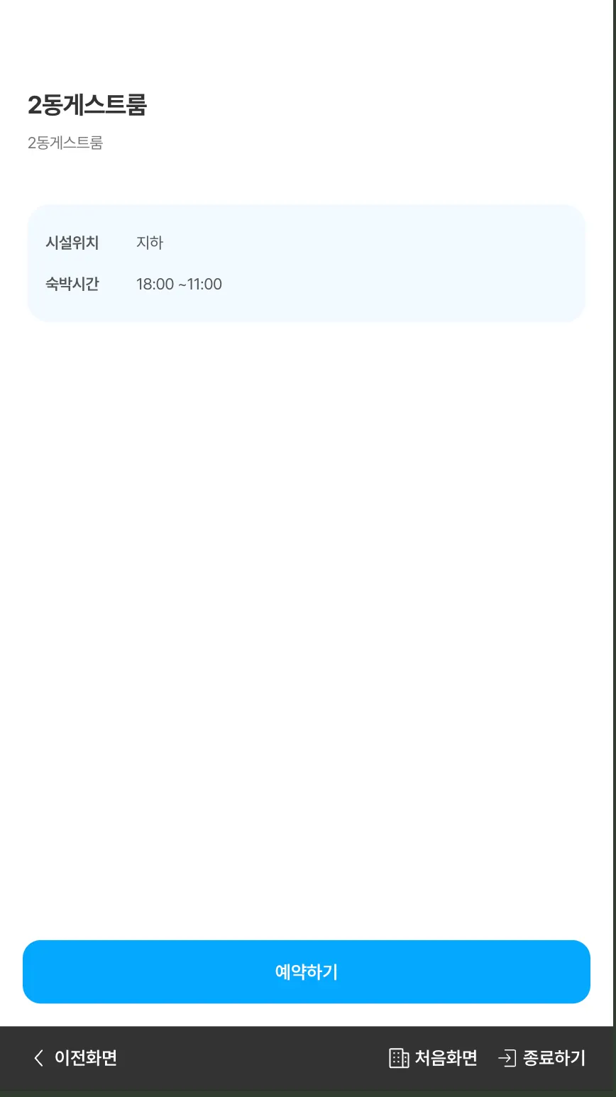 시설 정보 페이지에서 [예약하기] 버튼을 누르면 숙박하고자 하는 날짜를 선택할 수 있습니다.
