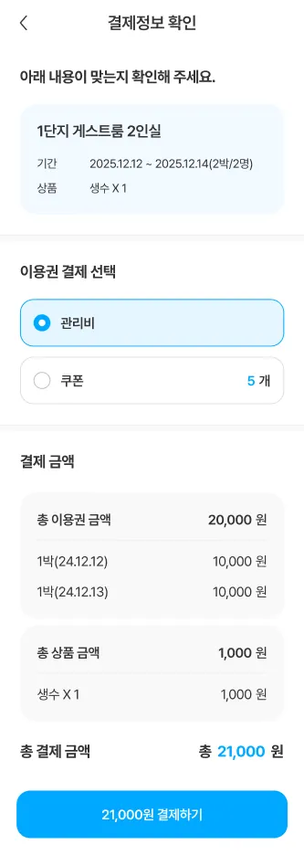 시설의 운영 정책에 따라 관리비 또는 커뮤니티 쿠폰으로 결제할 수 있습니다.