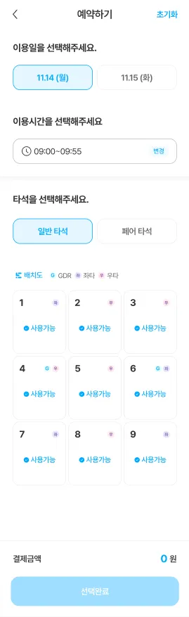 [초기화] 버튼을 누르면 선택한 일정이 모두 초기화되고, [선택완료] 버튼을 누르면 시설 옵션에 따라 상품을 구매할 수 있습니다.