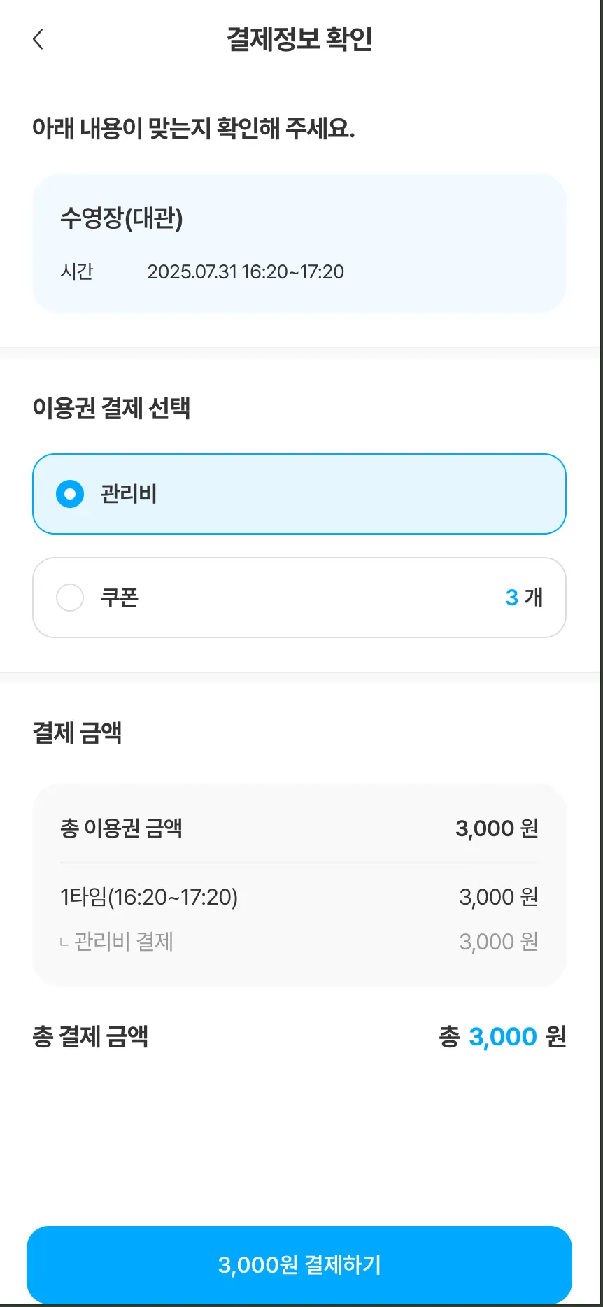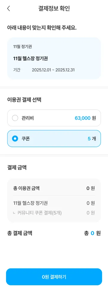 시설 운영 방식에 따라 이용권은 관리비나 커뮤니티 쿠폰으로 결제할 수 있습니다.