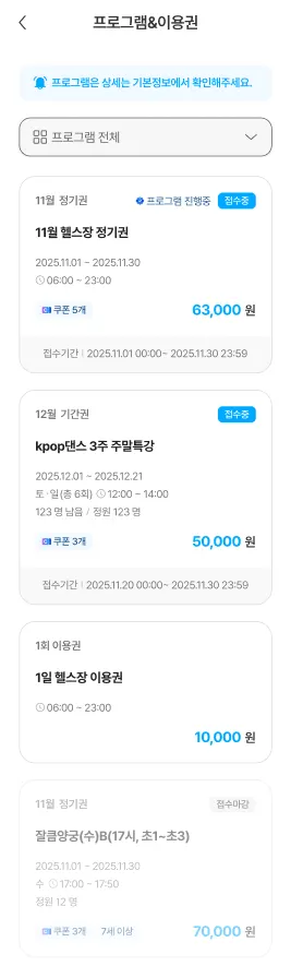 상단의 [프로그램] 버튼을 누르면, 피트니스 시설에서 판매 중인 이용권을 프로그램별로 확인할 수 있습니다.