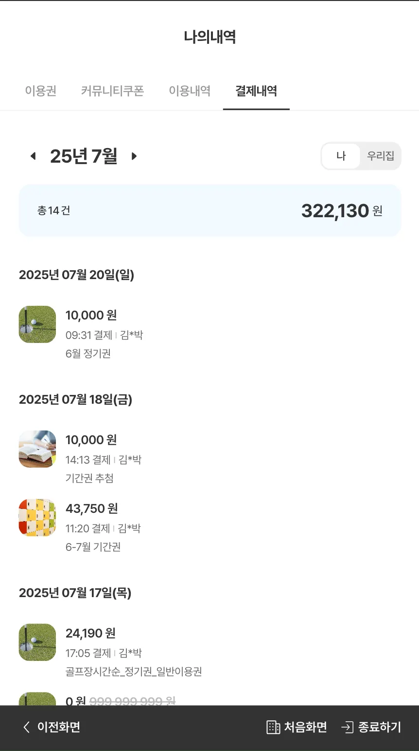 [나]를 선택하면 본인의 결제내역만 확인이 가능하며, [우리집]을 선택하면 세대 구성원 모두의 결제내역을 확인할 수 있습니다.