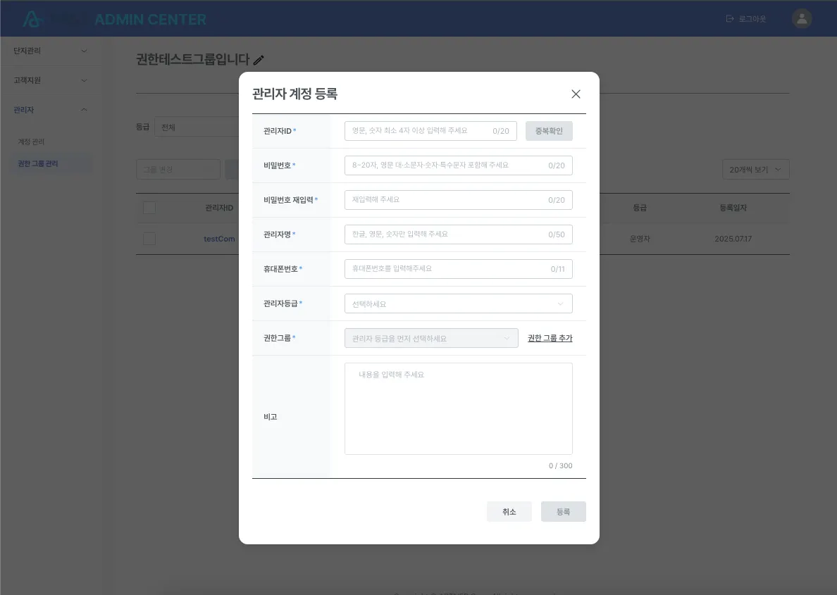 단지 관리자 계정을 생성 / 수정 / 삭제할 수 있습니다.