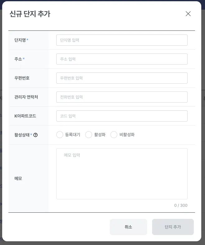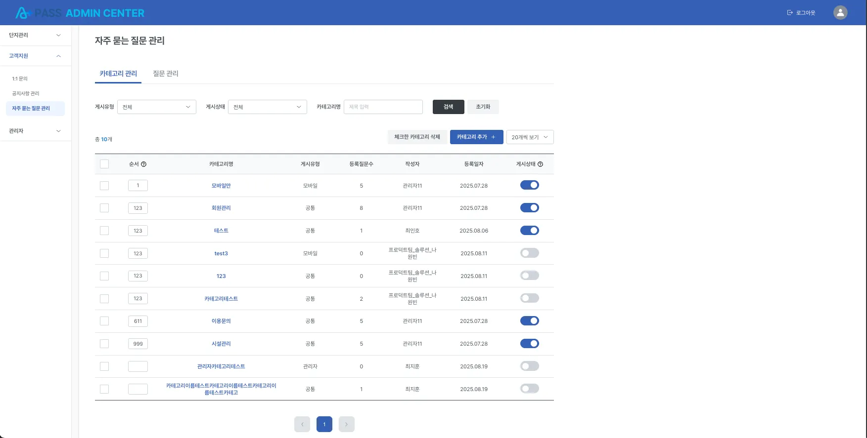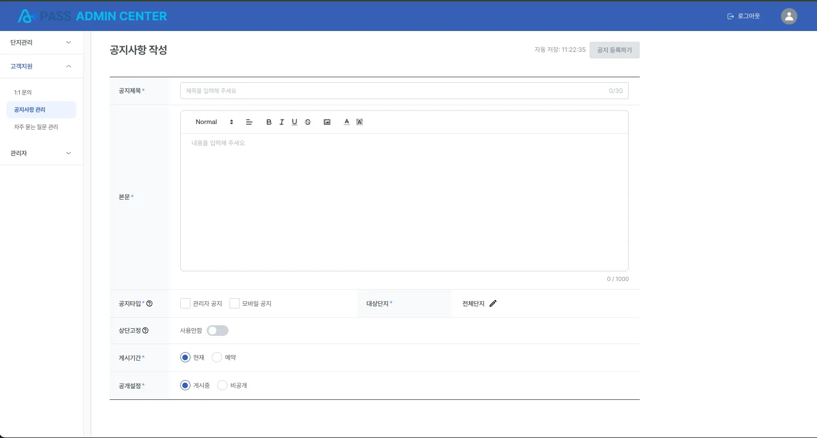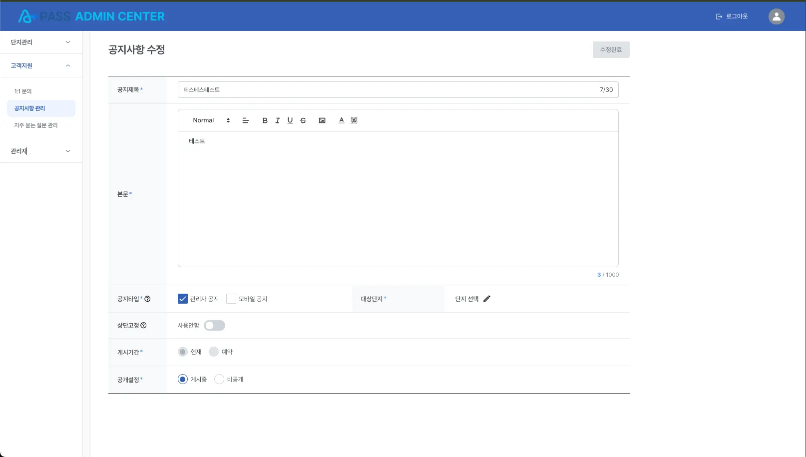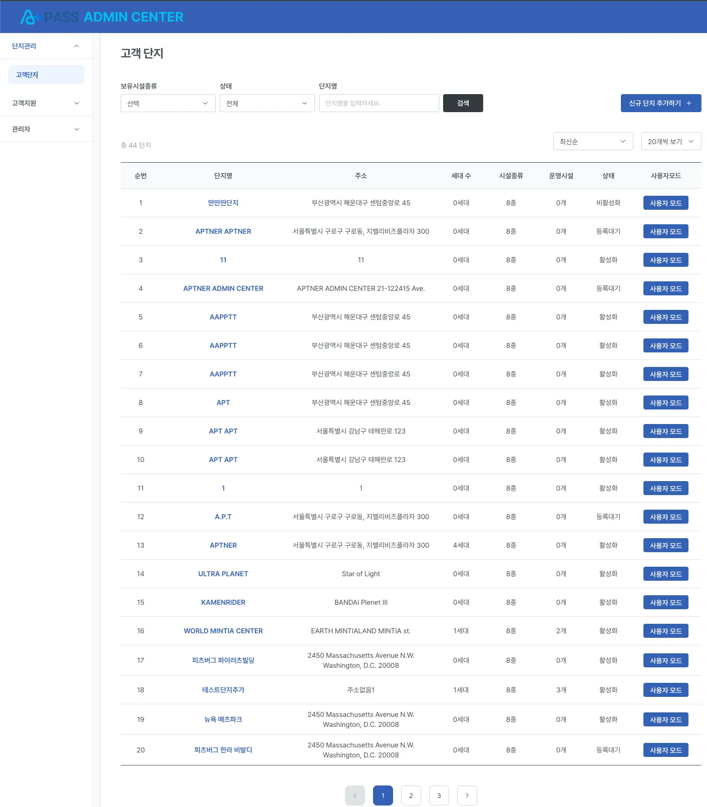 PASS 에 가입한 고객단지의 등록 / 수정 / 관리를 확인 할 수 있습니다.
