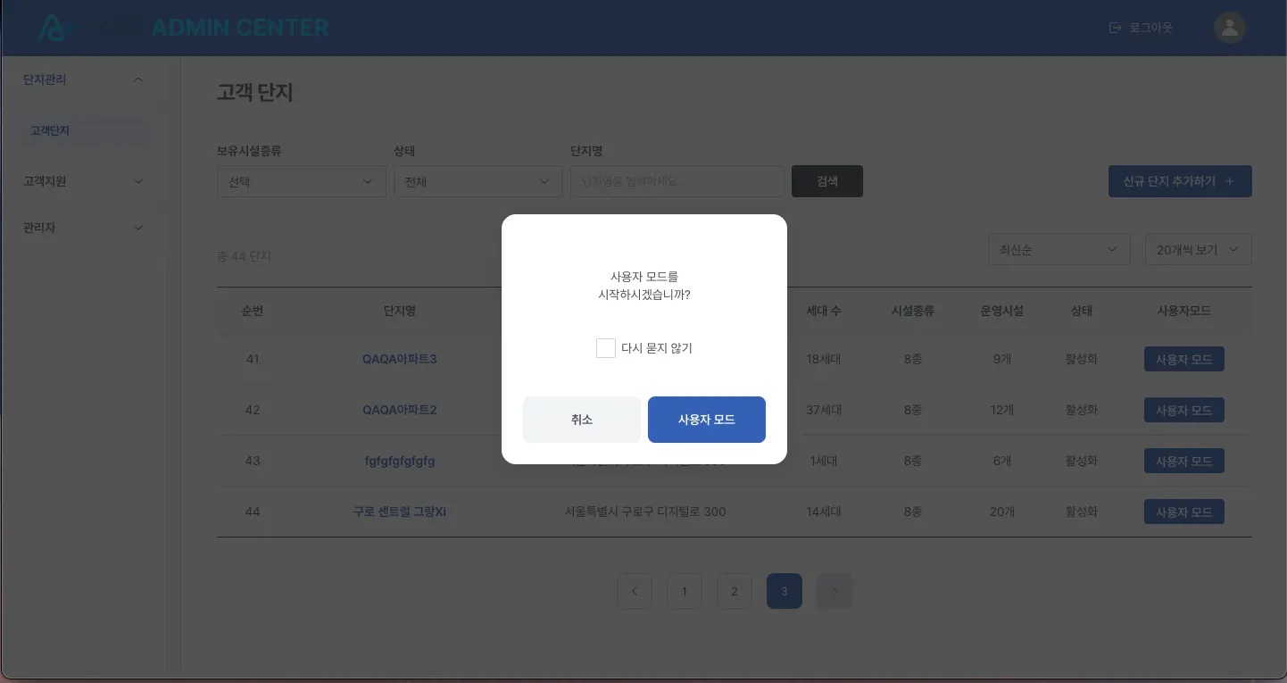 팝업의 사용자 모드 클릭시 해당 단지 페이지로 이동 후 조회 및 설정 가능