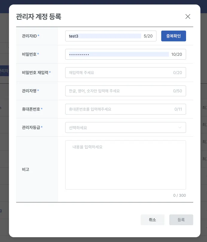 관리자 ID 는 등록시 변경 불가능하며, 중복이 불가능합니다.