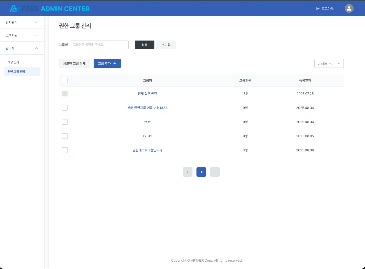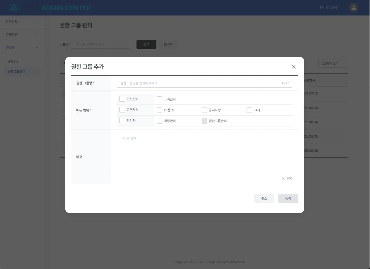 관리자를 등록할 수 있으며, 등록된 관리자는 해당 권한그룹에 속합니다.