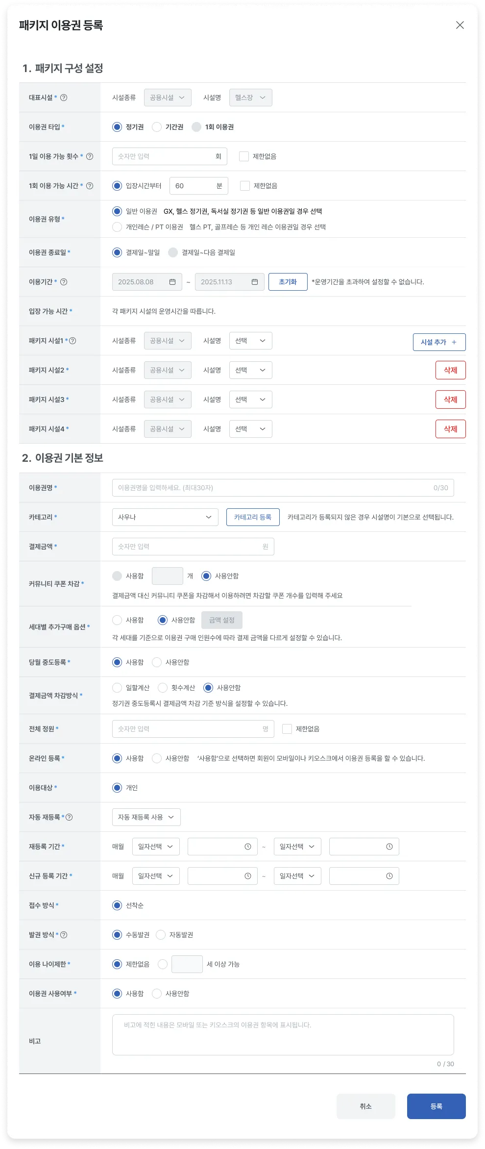 시설정보 등록이 완료 [이용권 등록] 버튼 클릭시 이용권 등록 팝업이 표시 됩니다.