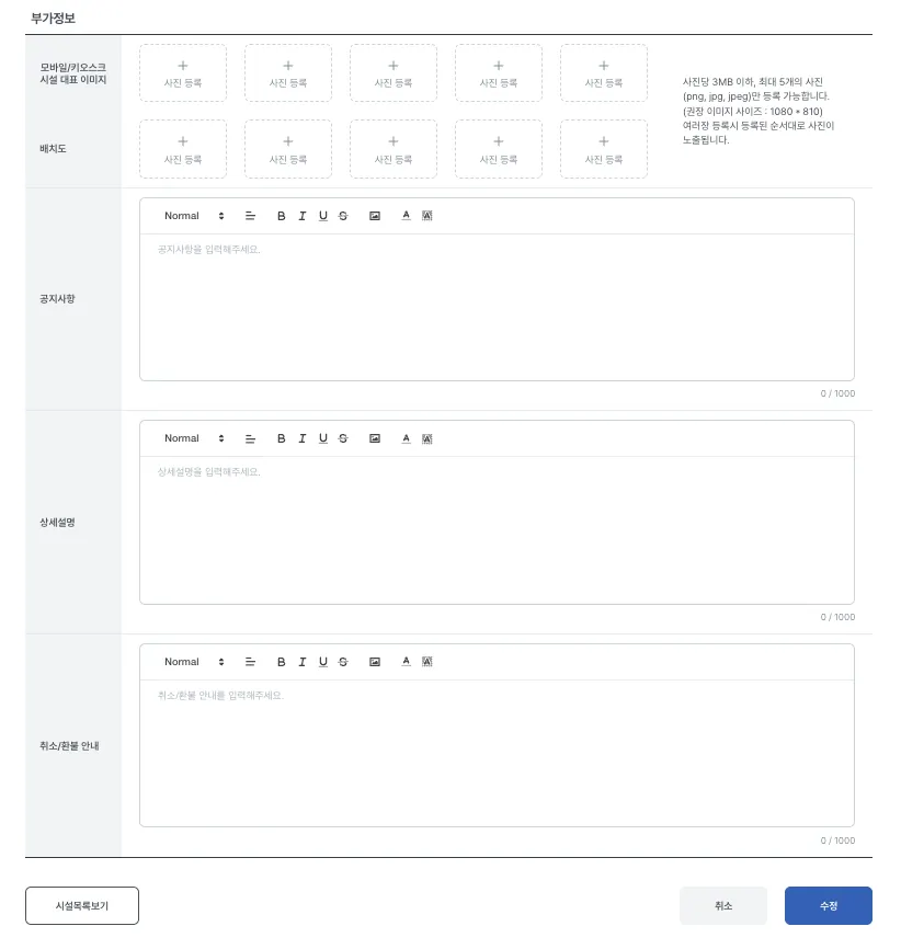 시설 배치도는 이미지를 등록할 경우 앱의 시설 상세 화면에 노출되고 등록하지 않으면 노출되지 않습니다.