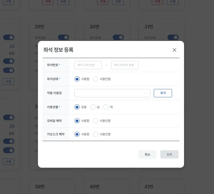 좌석등록시 공용 / 남 / 여 로 성별에 따른 좌석을 설정할 수 있습니다.