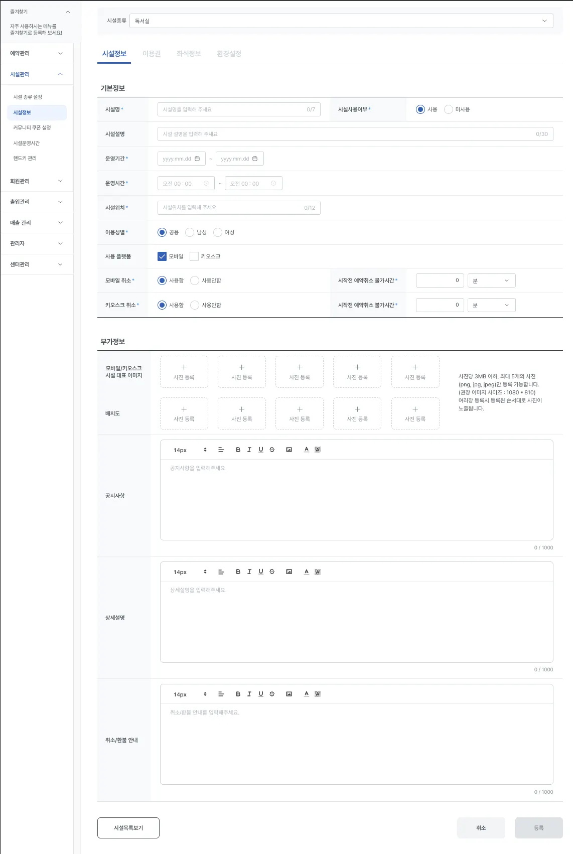 카테고리는 기본적으로 시설명이 카테고리에 등록되어 있으며 추가 카테고리 생성 필요시 [카테고리 등록] 버튼 클릭시 카테고리를 등록할 수 있습니다.