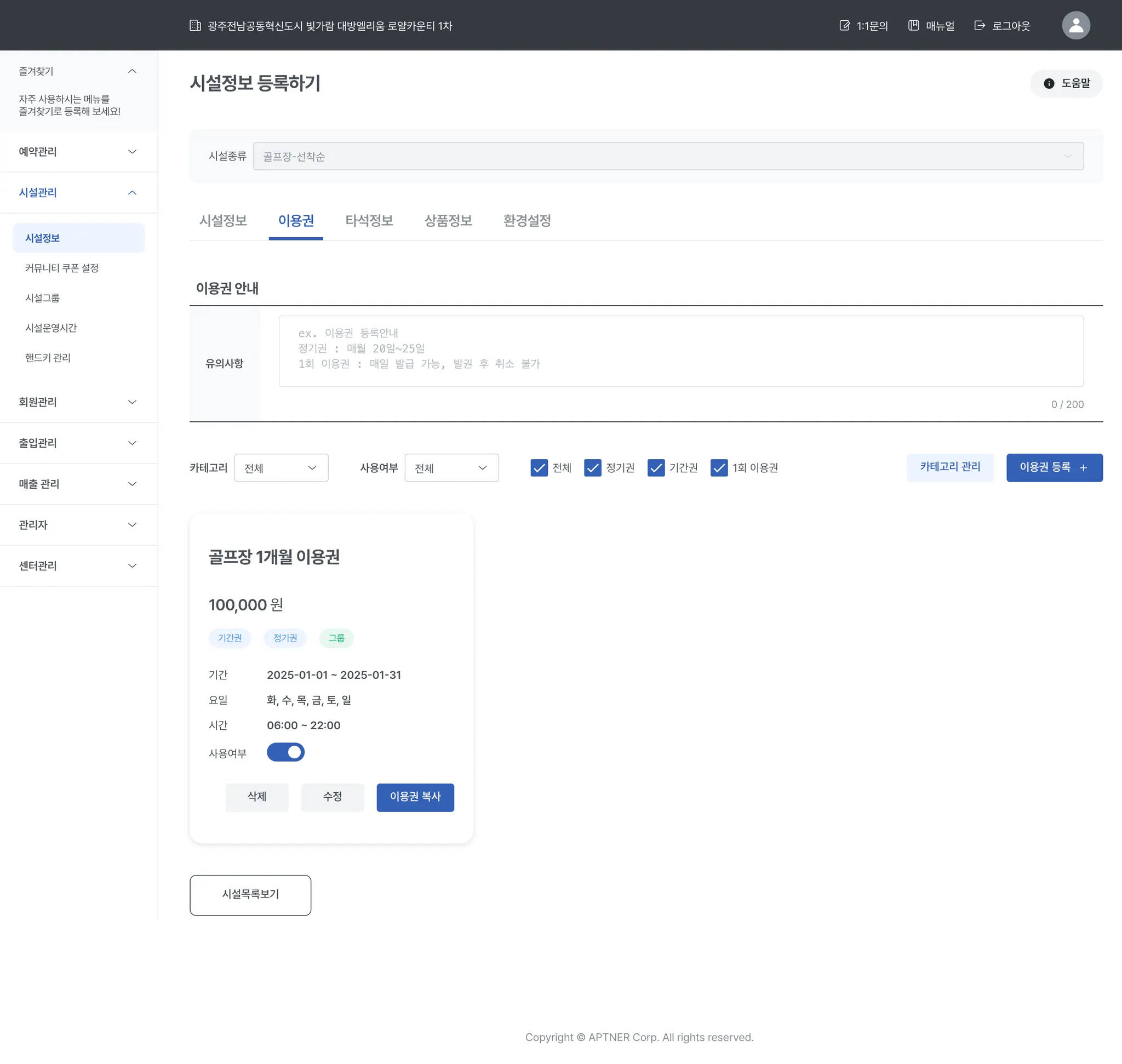 정기권 : 매월 재등록이 이루어지는 이용권으로 자동재등록과 수동재등록을 설정해서 사용가능합니다.