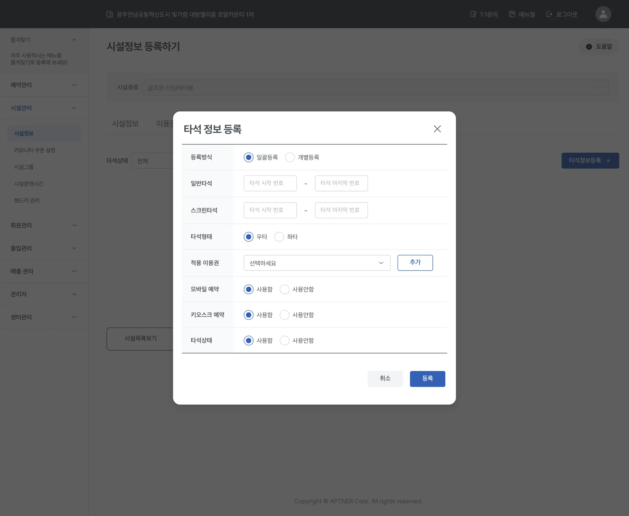 일반타석과 스크린타석이 나누어진 경우 개별로 입력해서 생성할 수 있습니다.