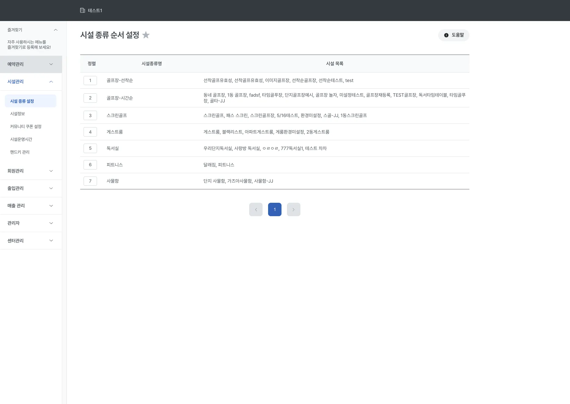 시설종류 순서 설정은 관리자 예약현황의 탭 순서에 영향을 주며, 모바일의 우리단지 시설예약의 순서에 영향을 줍니다.