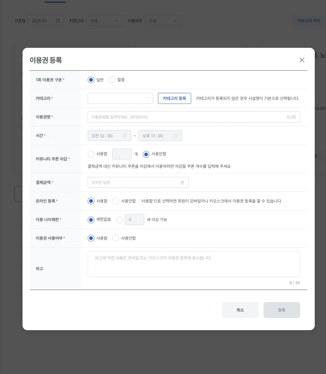 이용권의 특이사항 및 설명을 작성 할 수 있습니다. 해당 내용은 모바일 / 키오스크에서 노출되지 않습니다.