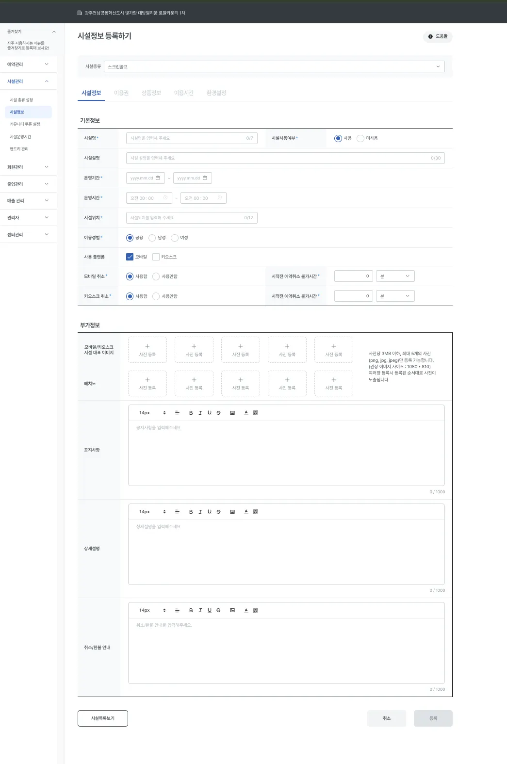 시설종류에서 등록할 시설 선택시 해당 시설 등록 템플릿이 표시됩니다.