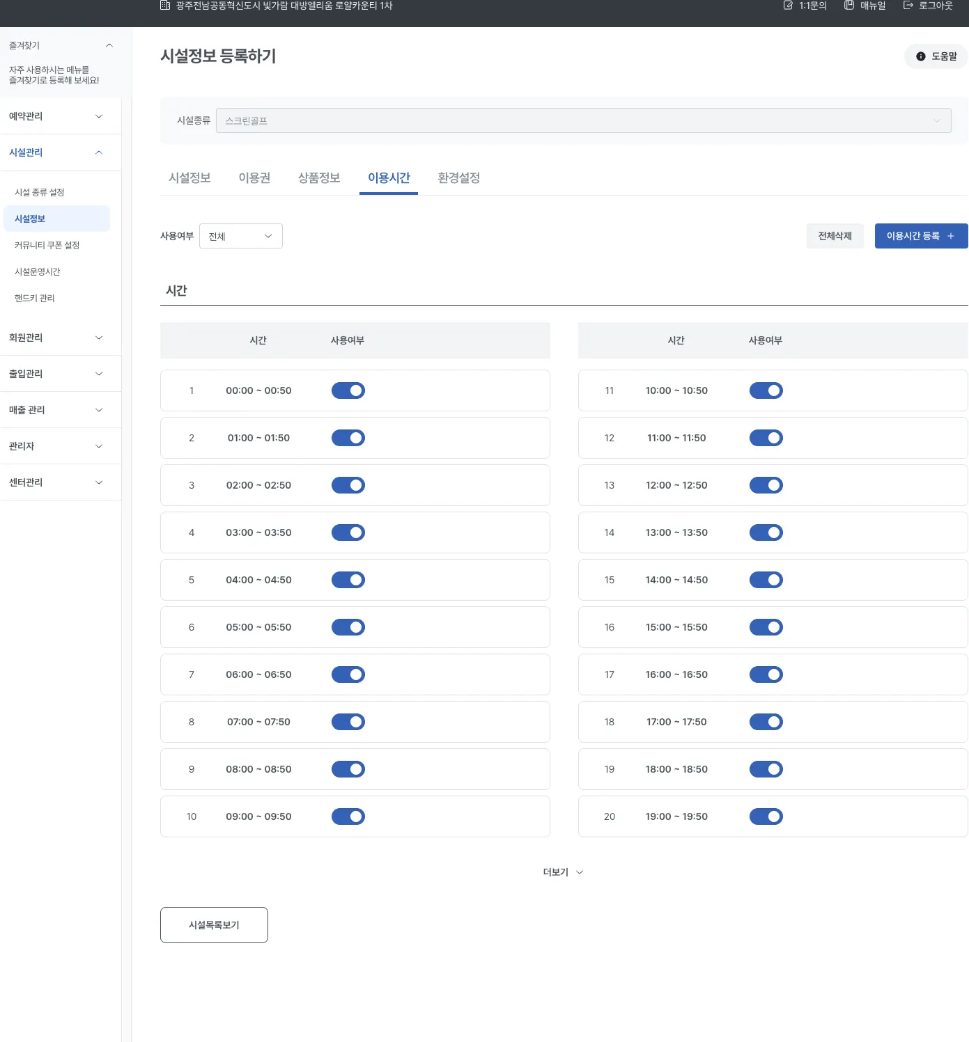관리자에서는 스크린골프 예약가능시간의 제한이 없습니다.