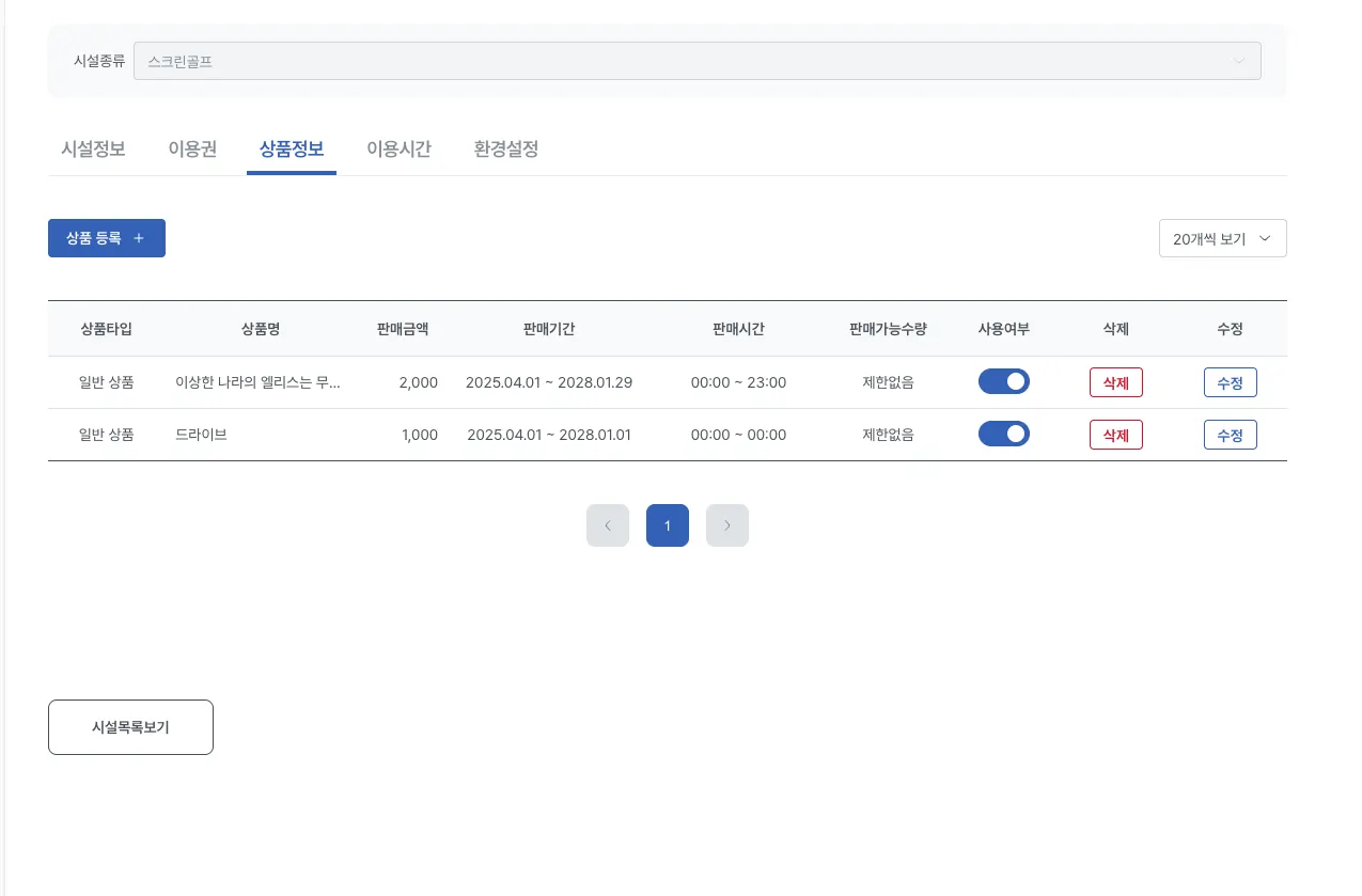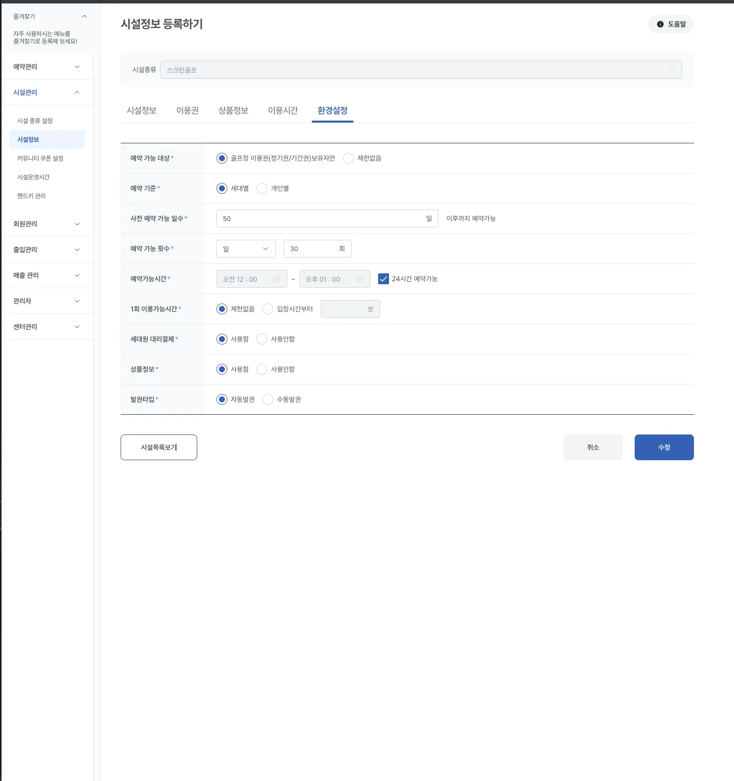 스크린골프의 이용시간에 사용여부를 수정할 수 있습니다.