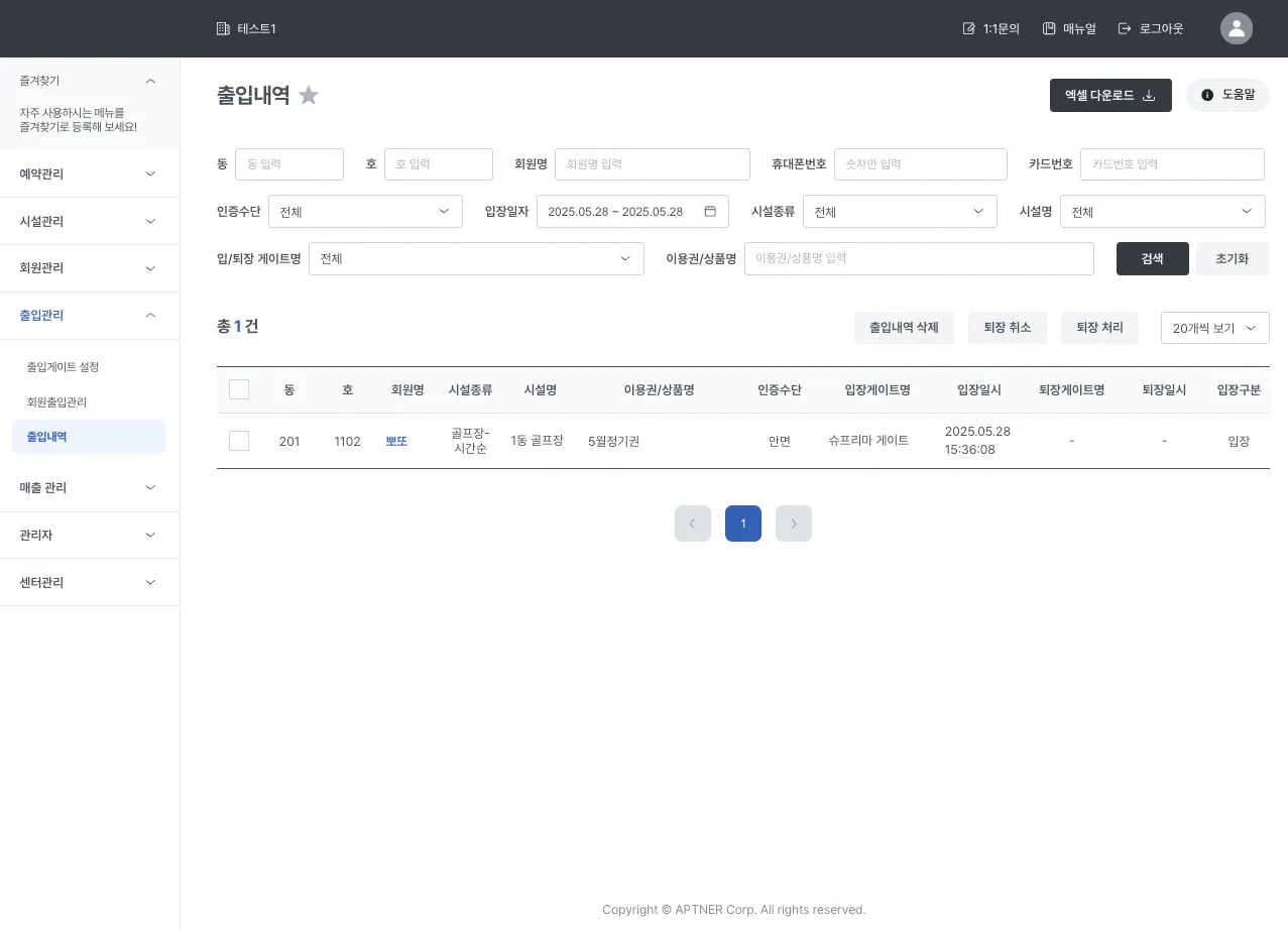 회원이 입퇴장한 시설종류, 시설명, 출입에 사용한 이용권, 입퇴장일시, 입퇴장 게이트명 등을 확인할 수 있습니다.