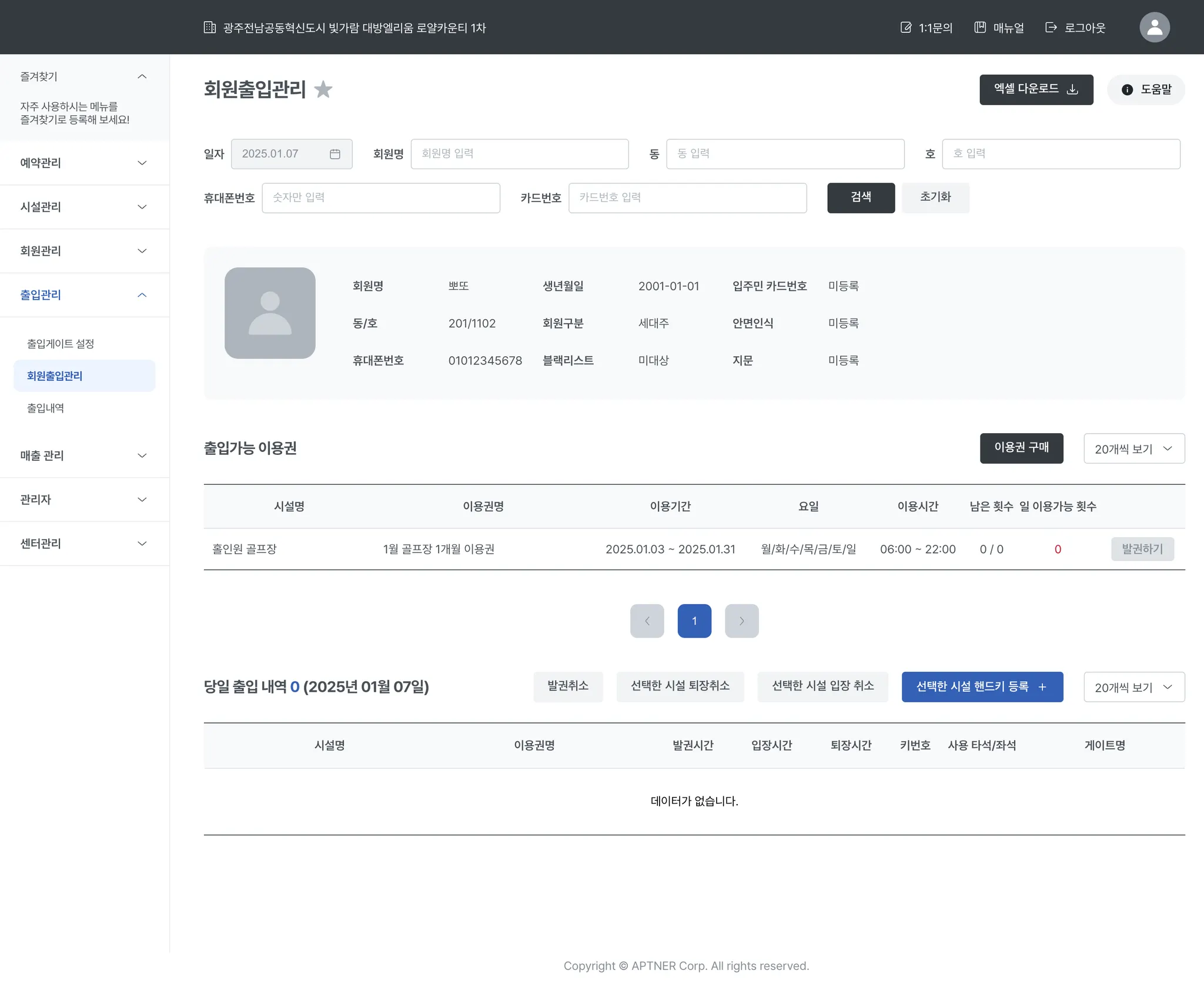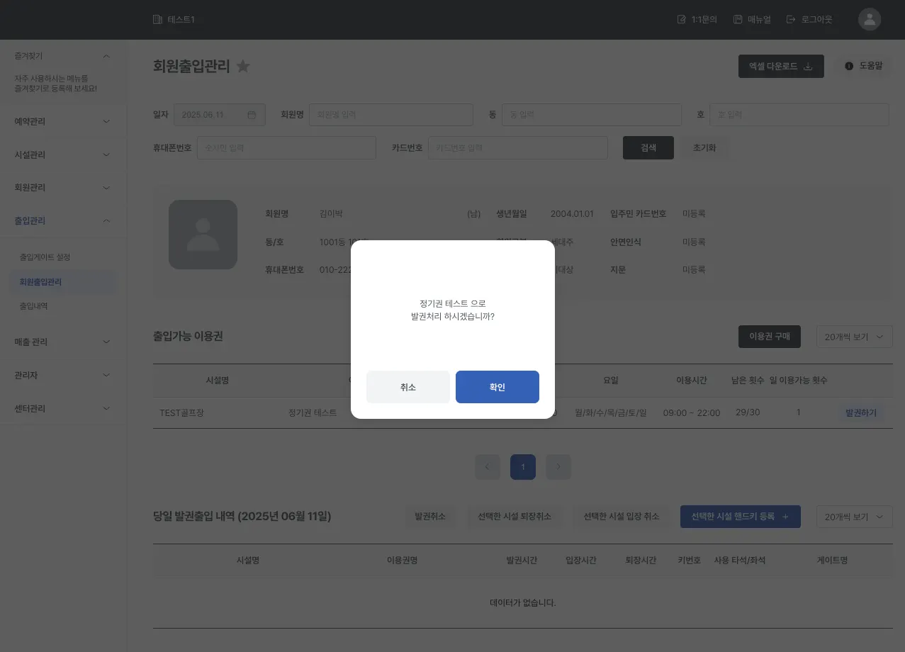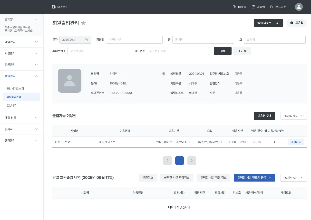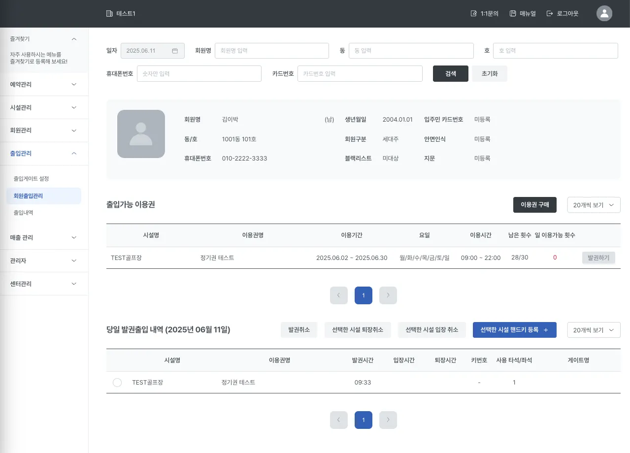 회원을 조회하면, 해당 회원의 정보와 출입 가능 이용권, 출입 내역을 당일 기준으로만 확인할 수 있습니다.