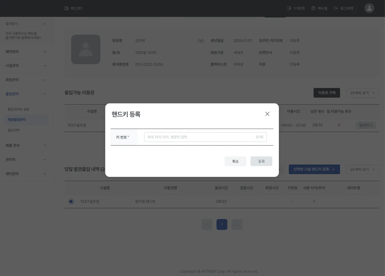 단, 등록 가능한 핸드키는 ‘시설관리 > 핸드키 관리’ 페이지에서 미리 등록된 핸드키에 한합니다.