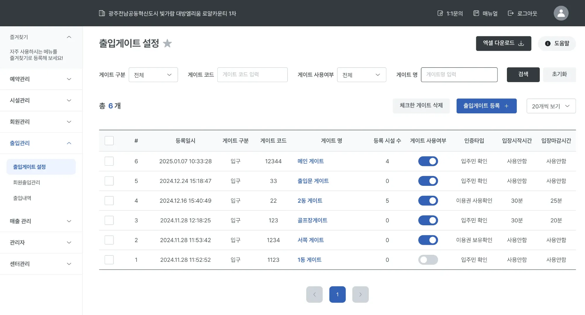 등록된 출입게이트 정보를 확인할 수 있습니다.