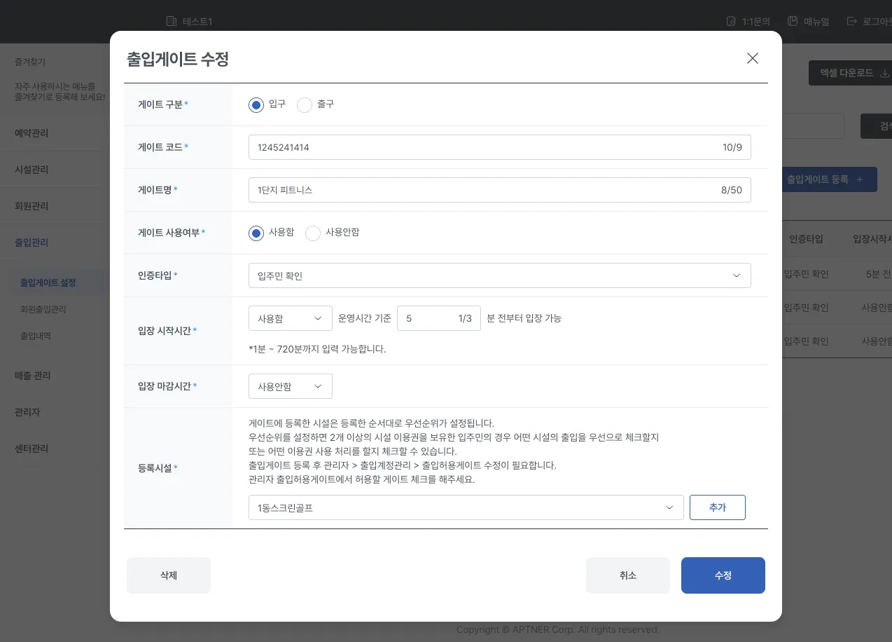 출입 게이트 등록 시 입력했던 정보를 항목별로 수정할 수 있습니다.