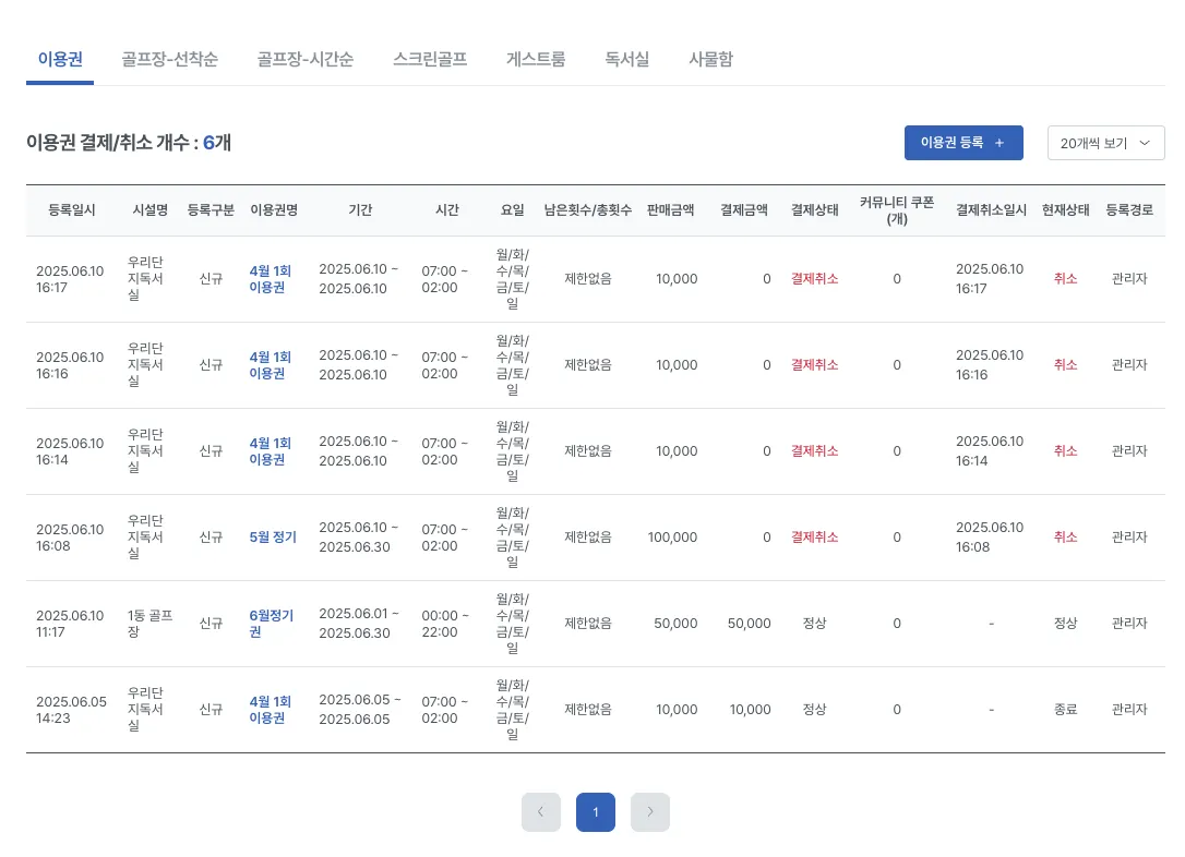 관리자는 회원을 대신하여 이용권을 등록해 줄 수 있습니다.