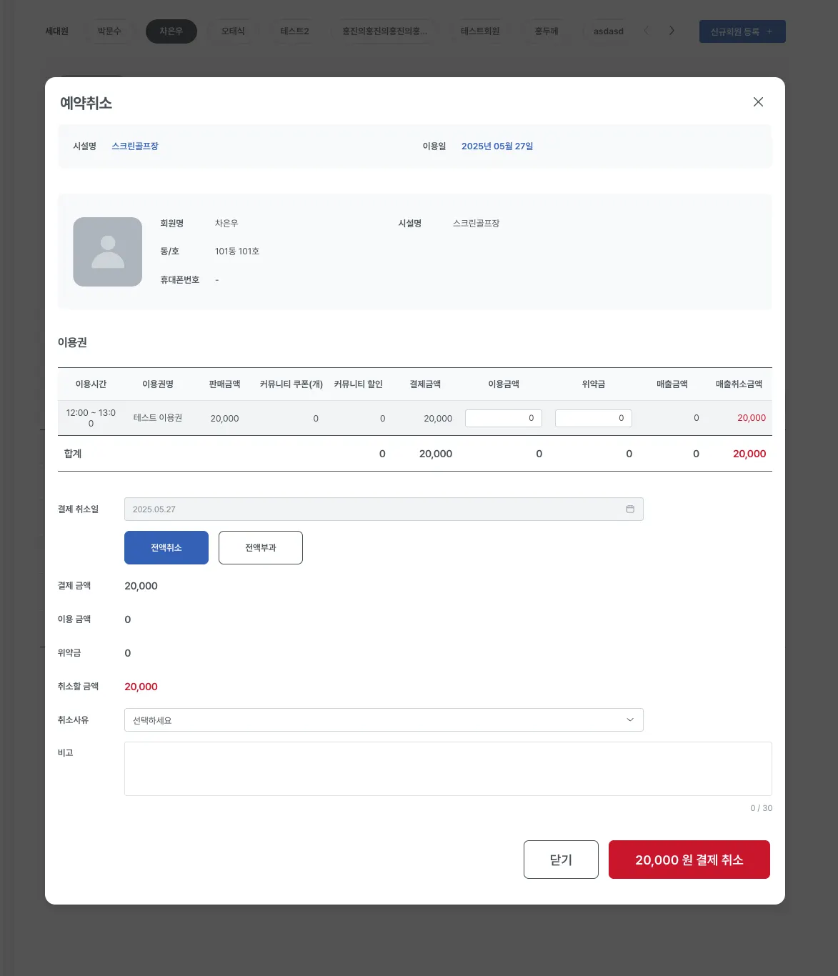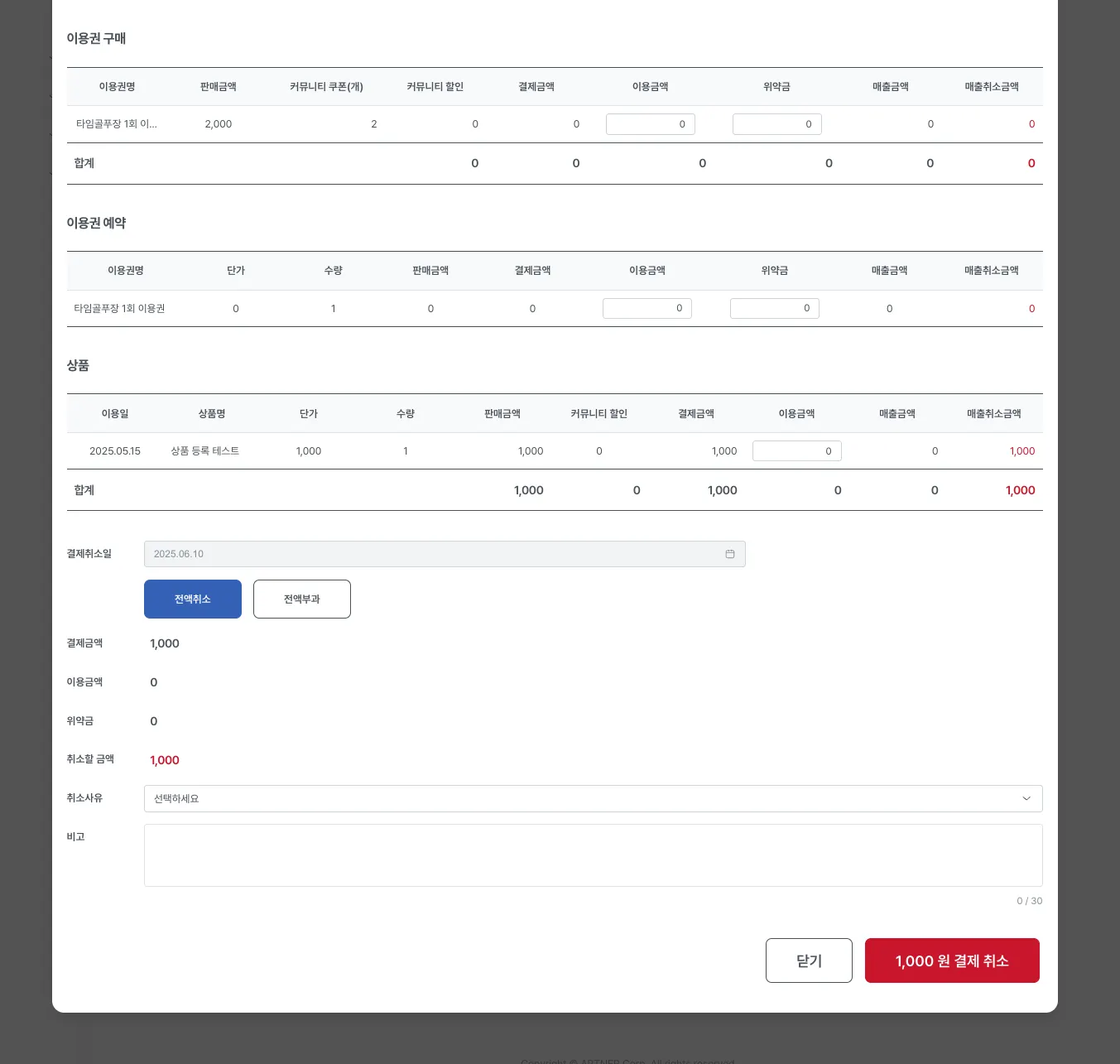 결제상세에서 이용금액, 위약금을 입력하면 해당 금액만큼 차감된 금액이 취소금액으로 반영됩니다.