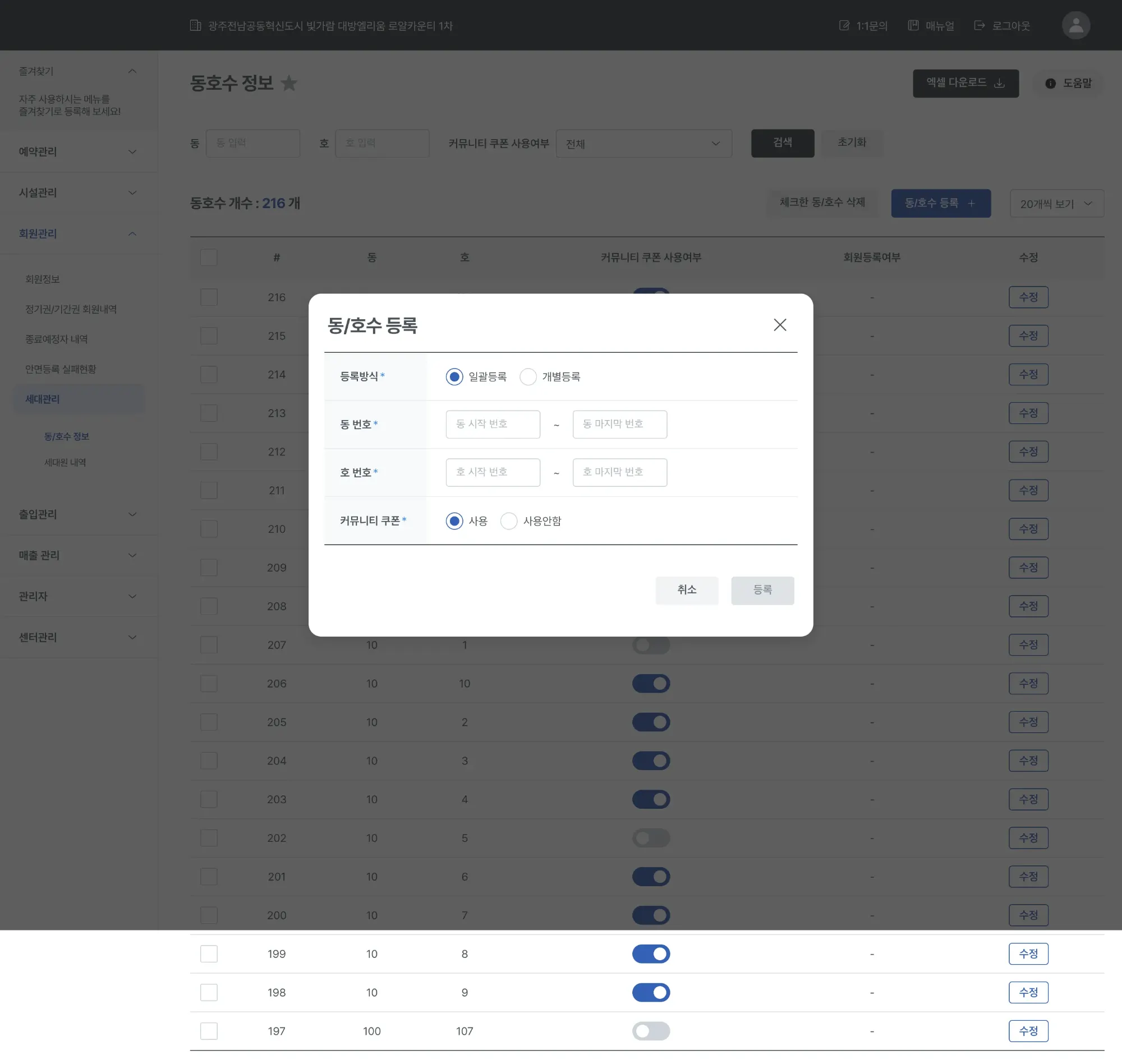 단지의 동 및 호수를 일괄 등록 또는 개별 등록이 가능합니다.