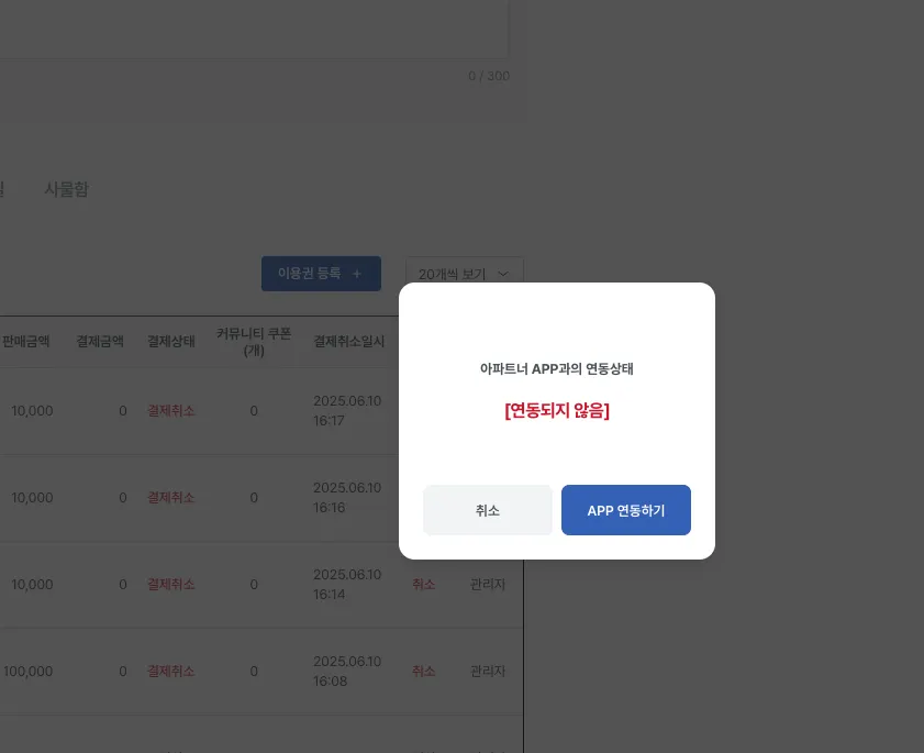 커뮤니티 회원이 아파트너 앱의 회원인 경우 APP연동이 완료 되어야 앱에서 커뮤니티 예약을 할 수 있습니다.