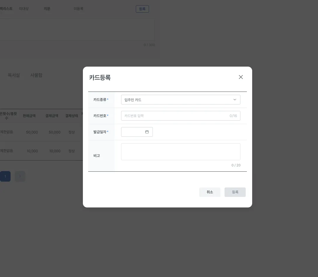 카드의 종류와 카드번호, 발급일자를 입력해서 등록할 수 있습니다.