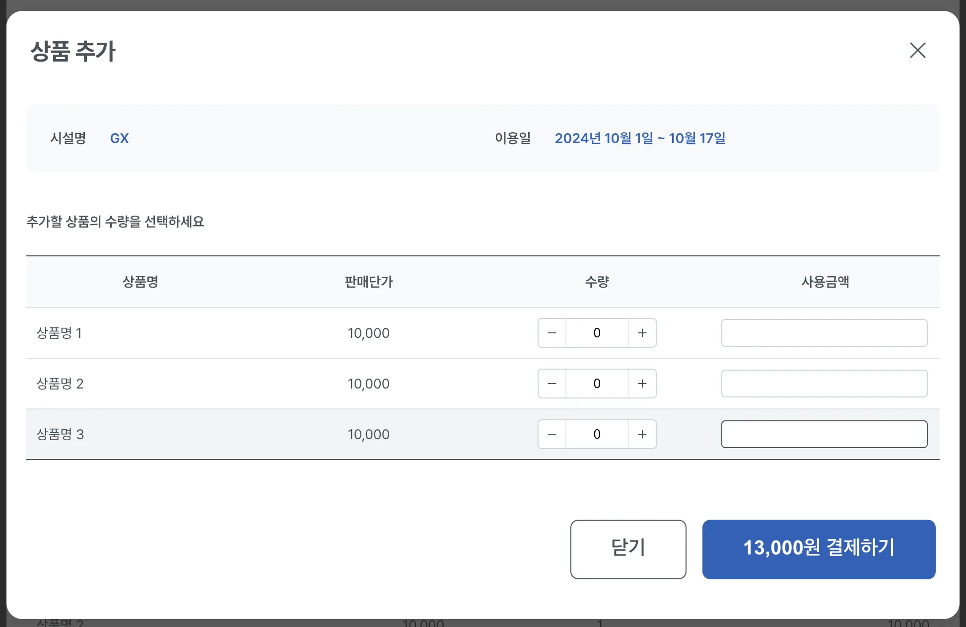 예약내역에서 [상품추가]버튼 클릭시 상품추가 팝업이 표시됩니다.