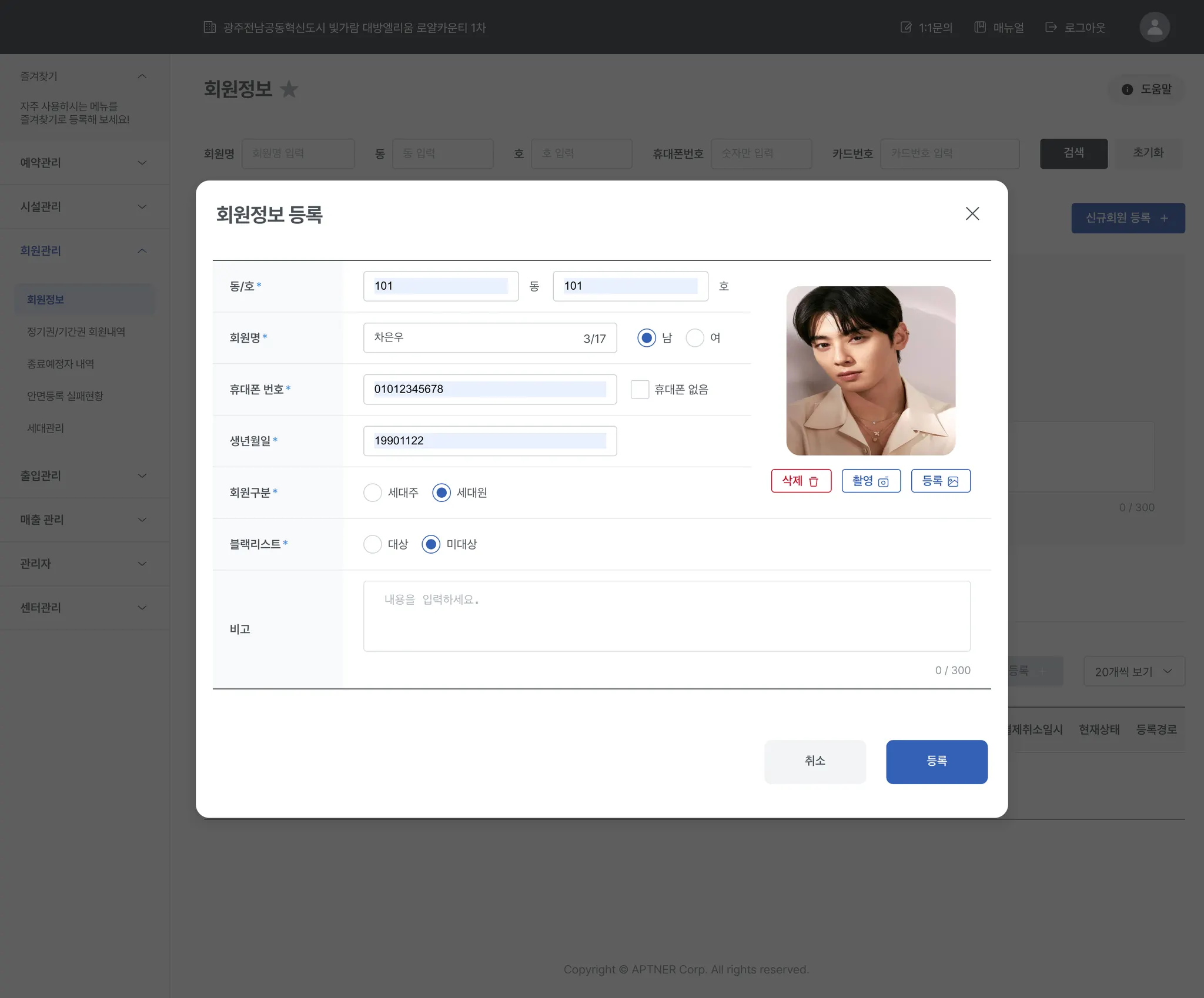 안면등록기 연동이 필요하며, 회원 촬영은 안면등록기로 촬영하여 등록 할 수 있습니다.