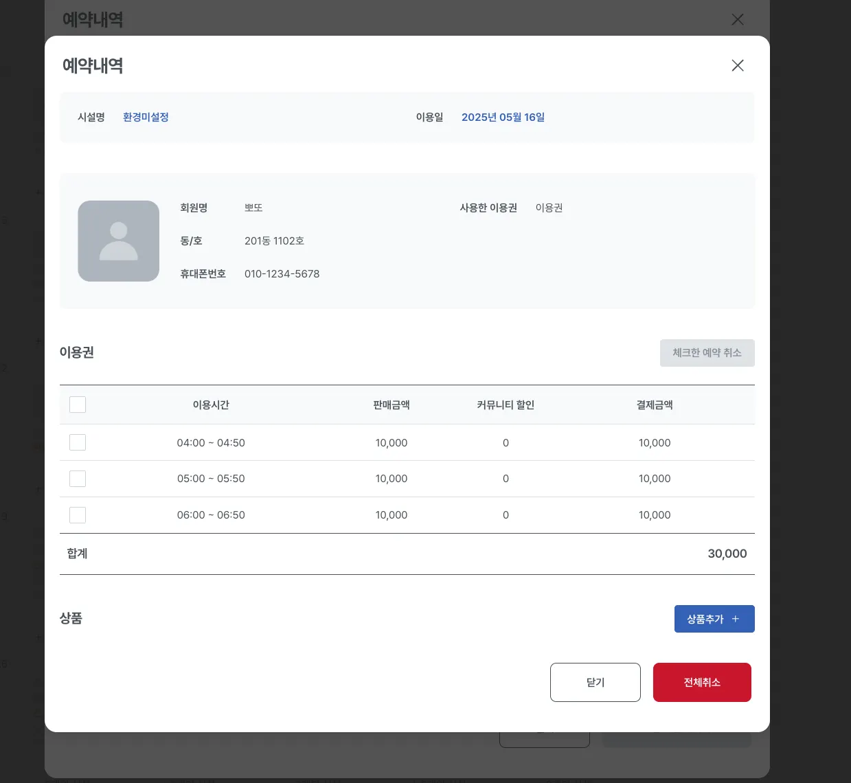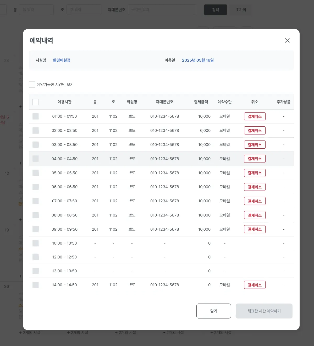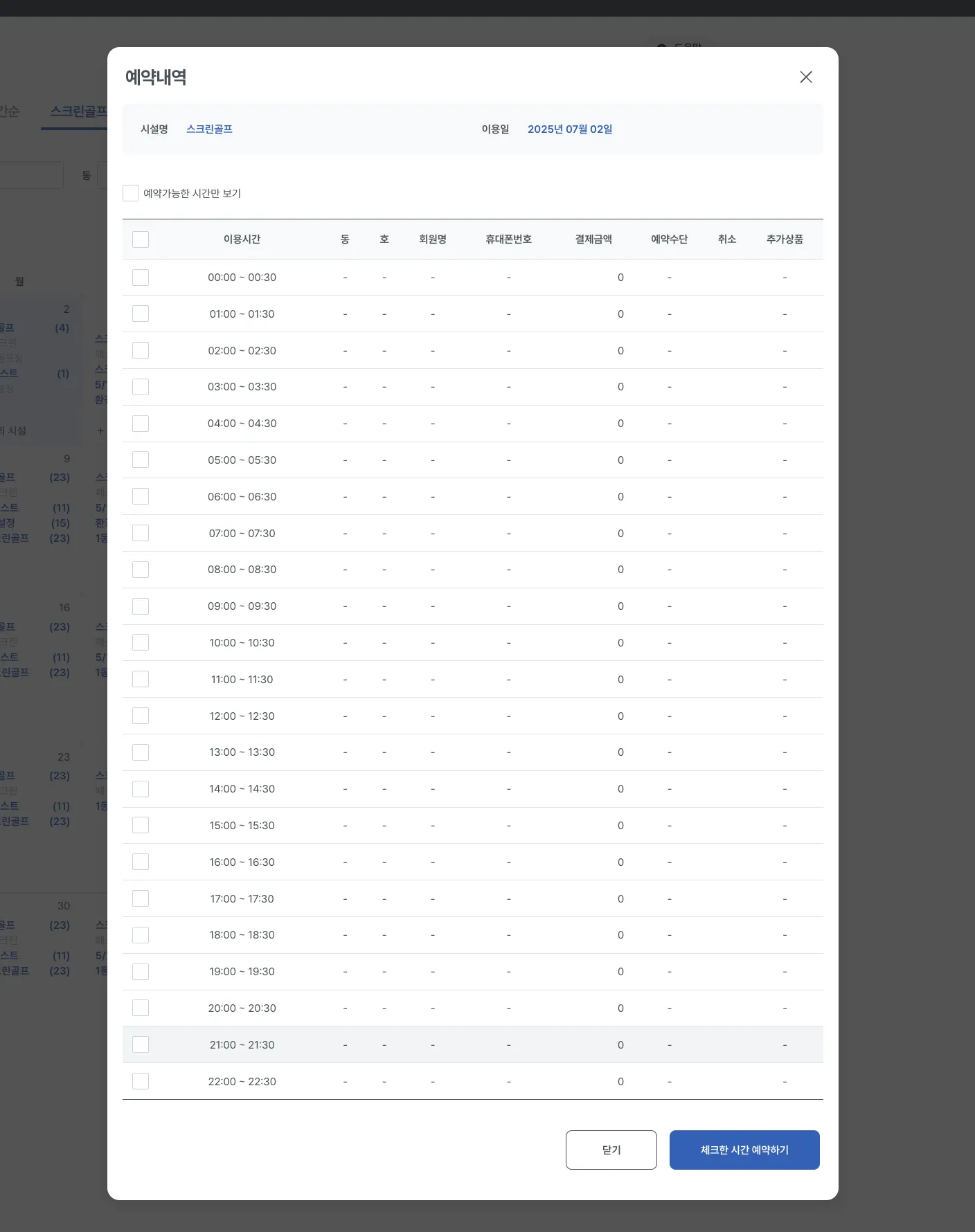 시설명을 클릭할 경우 모달 팝업이 노출되며, 여기서 시설을 기준으로 예약 현황을 확인할 수 있습니다.