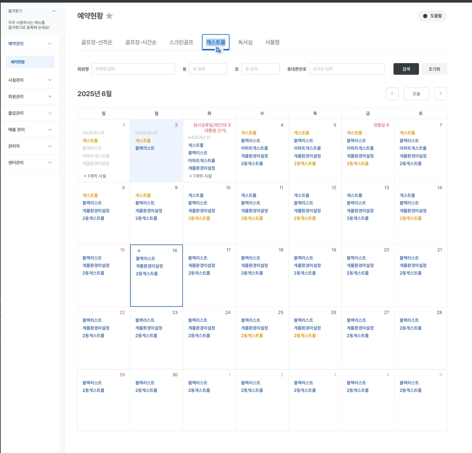 회원명을 검색할 경우, 해당 회원이 예약내역이 있으면 시설명이 노란색으로 표기됩니다.