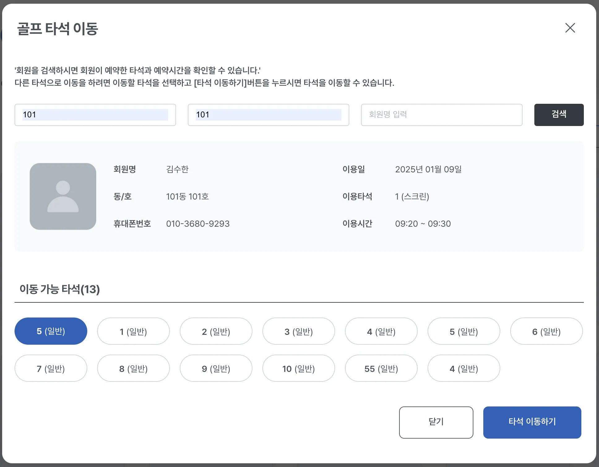 이용전이거나 이용중인 타석을 이동하고 싶을 경우 [타석이동] 버튼 클릭하면 회원정보 검색후 이동가능한 타석에서 이동할 타석을 선택하면 타석이동이 가능합니다.