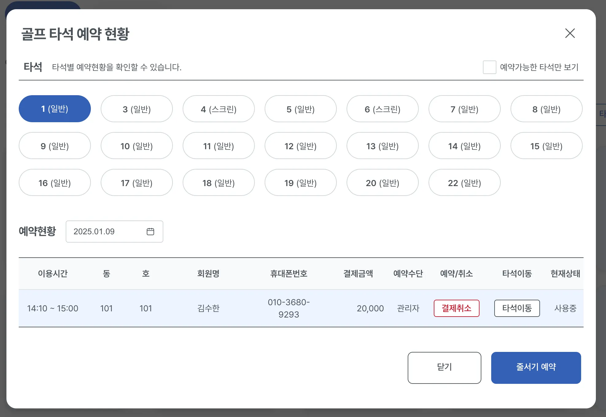 [타석예약현황] 버튼 클릭시 시설내의 타석 별 예약 현황을 확인할 수 있고, 회원의 골프타석예약을 할 수 있습니다.