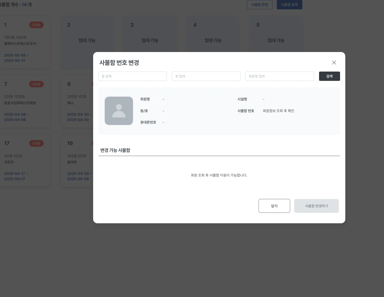 [사물함변경] 버튼 클릭시 사물함변경 팝업이 표시됩니다.