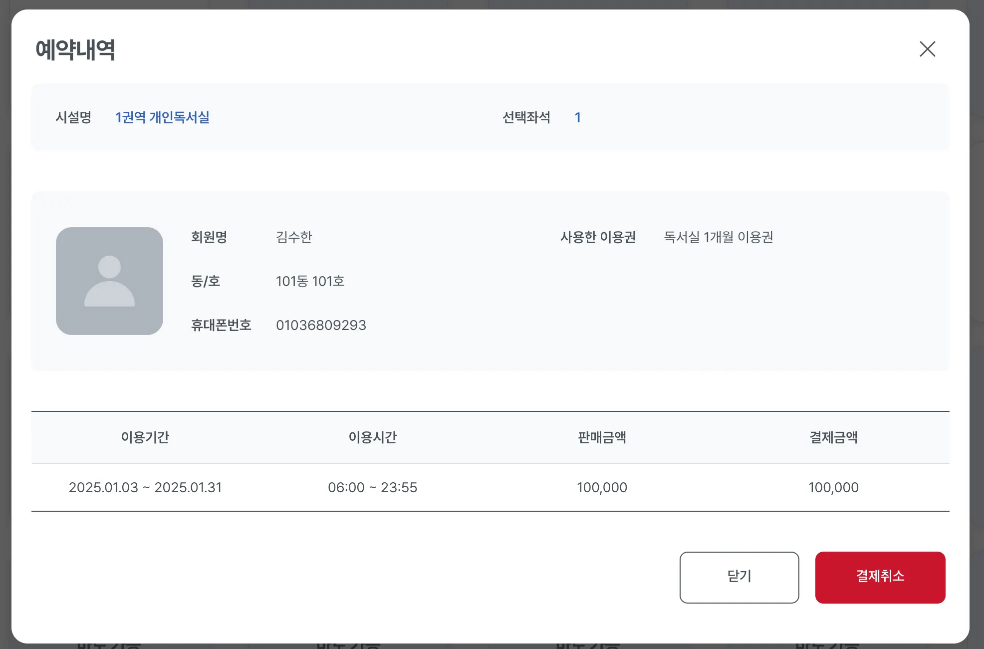 회원정보 조회 후 [결제취소]버튼 클릭시 결제취소 팝업이 표시됩니다.